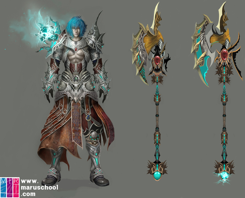 양재식 학생의 작업물입니다. 셋트 아이템인 갑옷을 입고 무기를 사용하면 무기가 변신하는 컨셉의 전사를 표현해봤습니다.