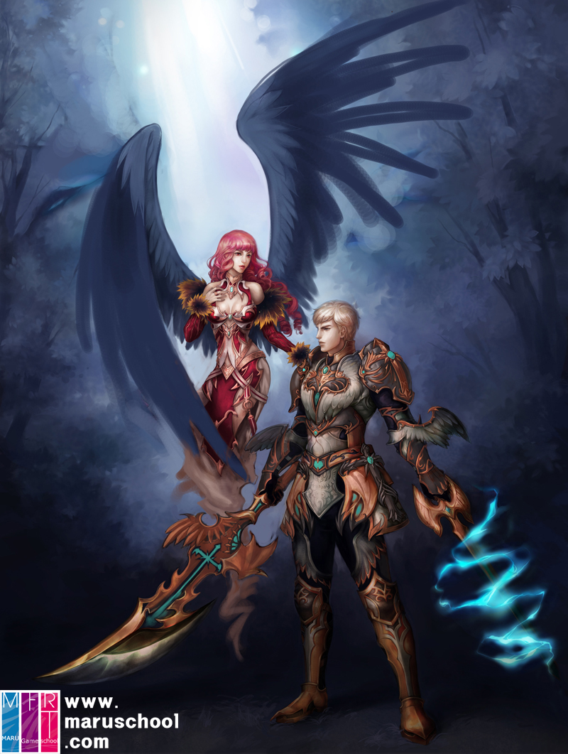 윤수정 학생의 작업물입니다. 정령을 소환해서 정령과 함꼐 싸우는 기사의 이미지를 표현한 작업물입니다.