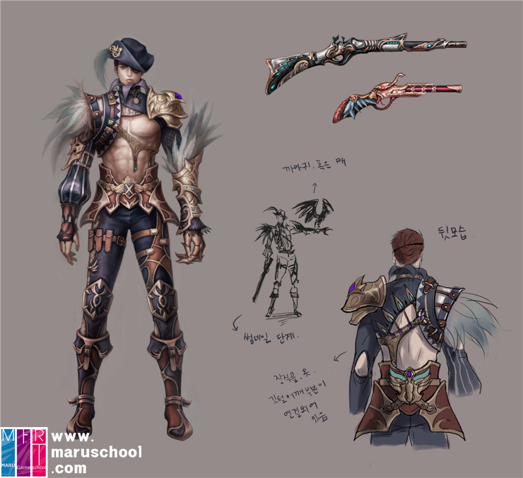 중세 컨셉에 총을 사용하는 남성 거너의 느낌을 살린 작업물입니다. 앞의 여검사와 같은 시대의 케릭터를 표현한 작업물입니다.