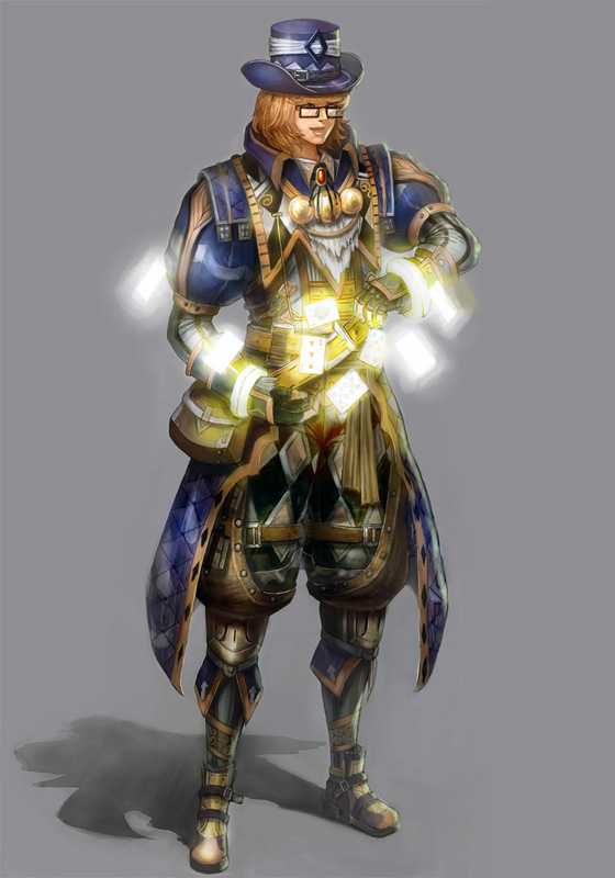 여러가지 카드와 주사위 등을 이용해서 전투에 임하는 겜블러라 불리우는 케릭터를 표현한 작업물입니다. 말 그대로 도박사라 그런지 운이 많이 따라줘야 할거 같은 케릭터네요 ^^
