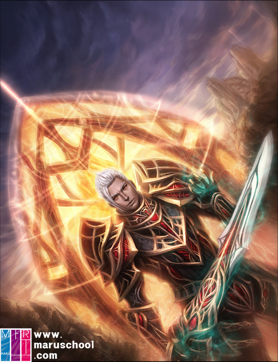 거대한 마법 요새를 등지고 비장한 결의를 다지는 마검사를 멋들어지게 표현한 작업물입니다. 검은 피부에 검은 갑옷 그리고 황금색의 광원이 조화롭게 표현된 재미있는 작업물입니다. 실력이 점점 더 훌륭해지는게 잘 보이는 박대기 학생의 작업물입니다.