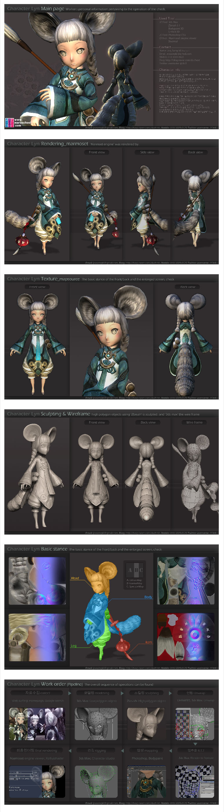 노말맵을 처음 배우고 만든 블레이드 앤 소울 캐릭터인데도 불구하고 특유의 귀엽고 독특한 느낌을 잘 뽑아주었습니다. 레이아웃 까지 신경쓴 높은 퀄리티의 작품이네요